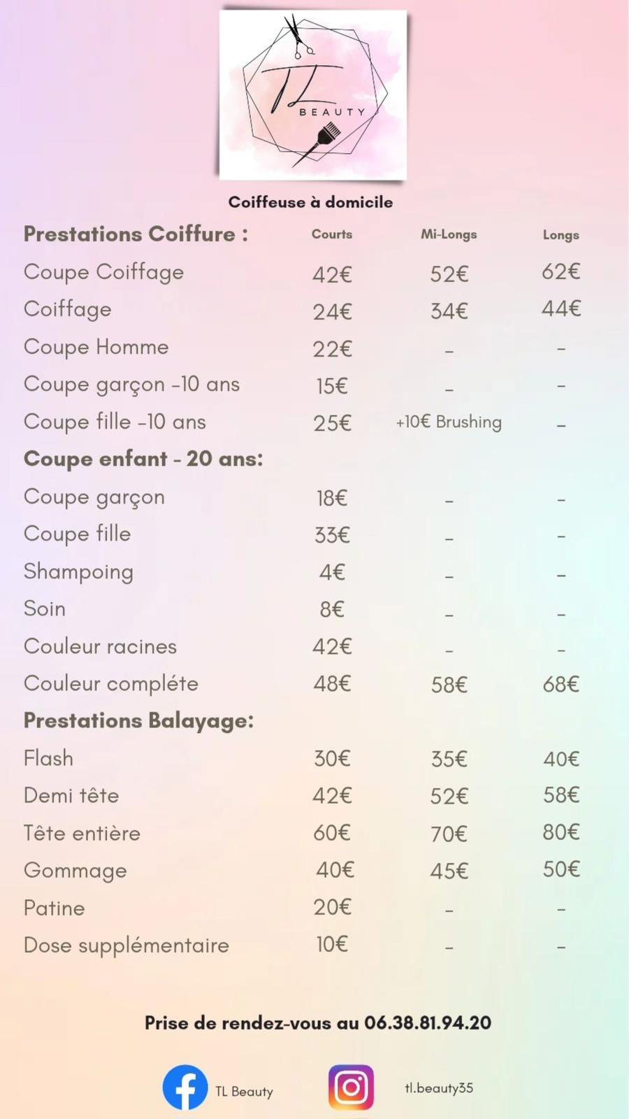 Lorsque vous choisissez de me faire confiance, chaque coupe devient une œuvre d'art, une transformation qui mettra en valeur votre personnalité et votre style. Que vous souhaitiez une coupe d'entretien pour préserver votre look actuel, une retouche pour rafraîchir vos pointes ou une transformation audacieuse pour refléter votre personnalité, je suis là pour donner vie à vos rêves capillaires. Mon expertise et mes conseils avisés vous guideront vers la coupe parfaite, celle qui vous ressemble le plus. Et si l'envie d'une nouvelle couleur vous prend, n'hésitez pas à me le dire, car je suis là pour anticiper vos besoins et vous offrir une nouvelle dimension de beauté.